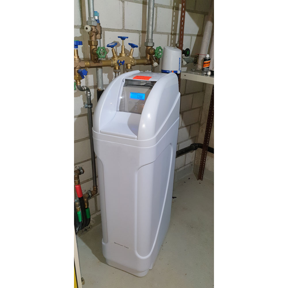 Ein Kabinettgehäuse für einen Salzvorrat von max. 70kg. Ein mengengesteuertes Zentralsteuerventil Typ Clack WS 1 CI IA, sowie ein integriertes Feinverschneidungsventil. Absaugeinrichtung und Verbindungsleitung zum Zentralsteuerventil. In der Anlage integriert, eine GFK- Druckflasche die mit hochwertigem Ionenaustauscherharz gefüllt ist.