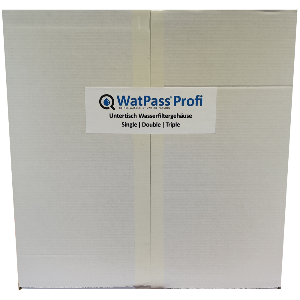 Das WatPass® TRIPLE Profi ist ein dreistufiges, professionelles Filtersystem aus Polypropylen mit hoher Druckstabilität und hohem Durchlauf. Die Auswahl der Filterkombination bestimmt den Einsatzbereich. Durch das inkludierte Anschlussset ist der Einbau ganz einfach! Das Gehäuse hat bei Drucktests 100.000 Zyklen mit 10 bar schadlos überstanden. Durch die speziellen Gewinde der Filtertasse ist der Filtertausch extrem einfach. Sichere Installation der Anschlüsse durch Ein-/Ausgang, die mit integrierten Messingeinsätzen versehen sind. Die Entnahme des gefilterten Trinkwassers, kann über einen vorhandenen Wasserhahn (bei entsprechender Patronenwahl) erfolgen. Die oft bessere Alternative ist ein gesondert zu installierender Wasserhahn bzw. ein Dreiwege-Wasserhahn. Natürlich ist auch ein Direktanschluss diverser Geräte wie Kaffemaschinen, Esspressomaschinen usw. möglich. Hier ist auf die benötigte Durchlaufleistung der anzuschliessenden Geräte zu achten! Installationsmaterial (Anschluss von Kaltwasserleitung zum Filter und vom Filter ausgehend an einen Wasserhahn) sind im Lieferumfang enthalten; ein Wasserhahn können sie optional bestellen.