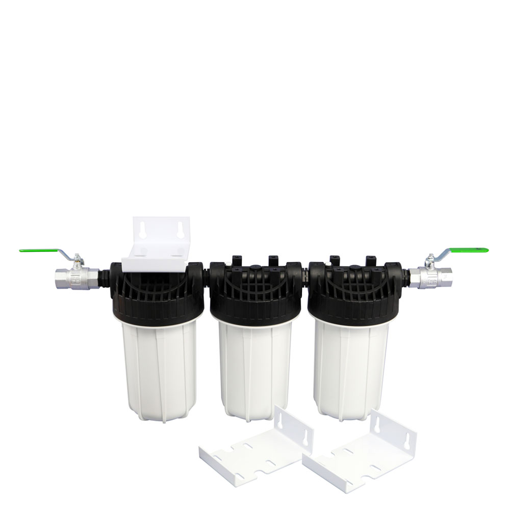 3x 10" Zoll Filtergehäuse, 2x Kugelhähne, 2x Wandhalterung, Doppelnippel & Reduzierstücke 1"