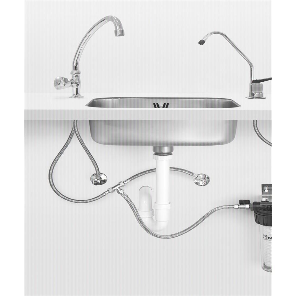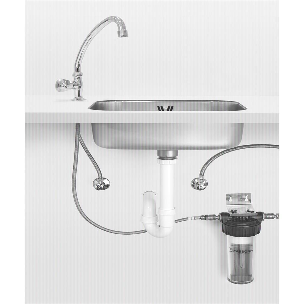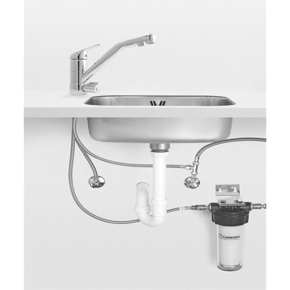 Das Filtergehäuse "Carbonit Vario HP" eignet sich zur einfachen Installation unter der Spüle in der Küche sowie später für einen komfortablen Wechsel der Filterpatrone. Die Entnahme des gefilterten Trinkwassers erfolgt über einen gesondert zu installierenden Wasserhahn bzw. kann über einen Dreiwege-Wasserhahn erfolgen. Installationsmaterial (Anschluss von Kaltwasserleitung zum Filter und vom Filter ausgehend an einen Wasserhahn) ist im Lieferumfang enthalten, ein Wasserhahn bitte nach Wunsch zusätzlich bestellen.