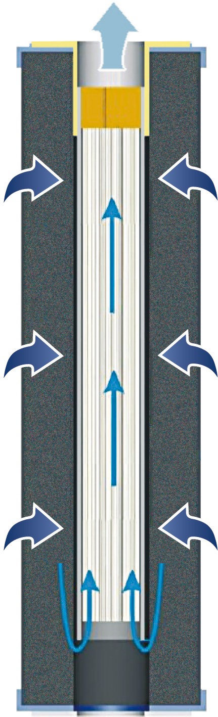 This filter cartridge EM Puro has been manufactured on the basis of the two-stage IFP Puro for Prime Inventions. It combines the special properties of a sintered CARBONIT® monoblock with a microfiltration of 0.15 µm through the inner capillary membrane. Even high loads that could accumulate in the human body are reliably retained. Minerals dissolved in the water are retained.