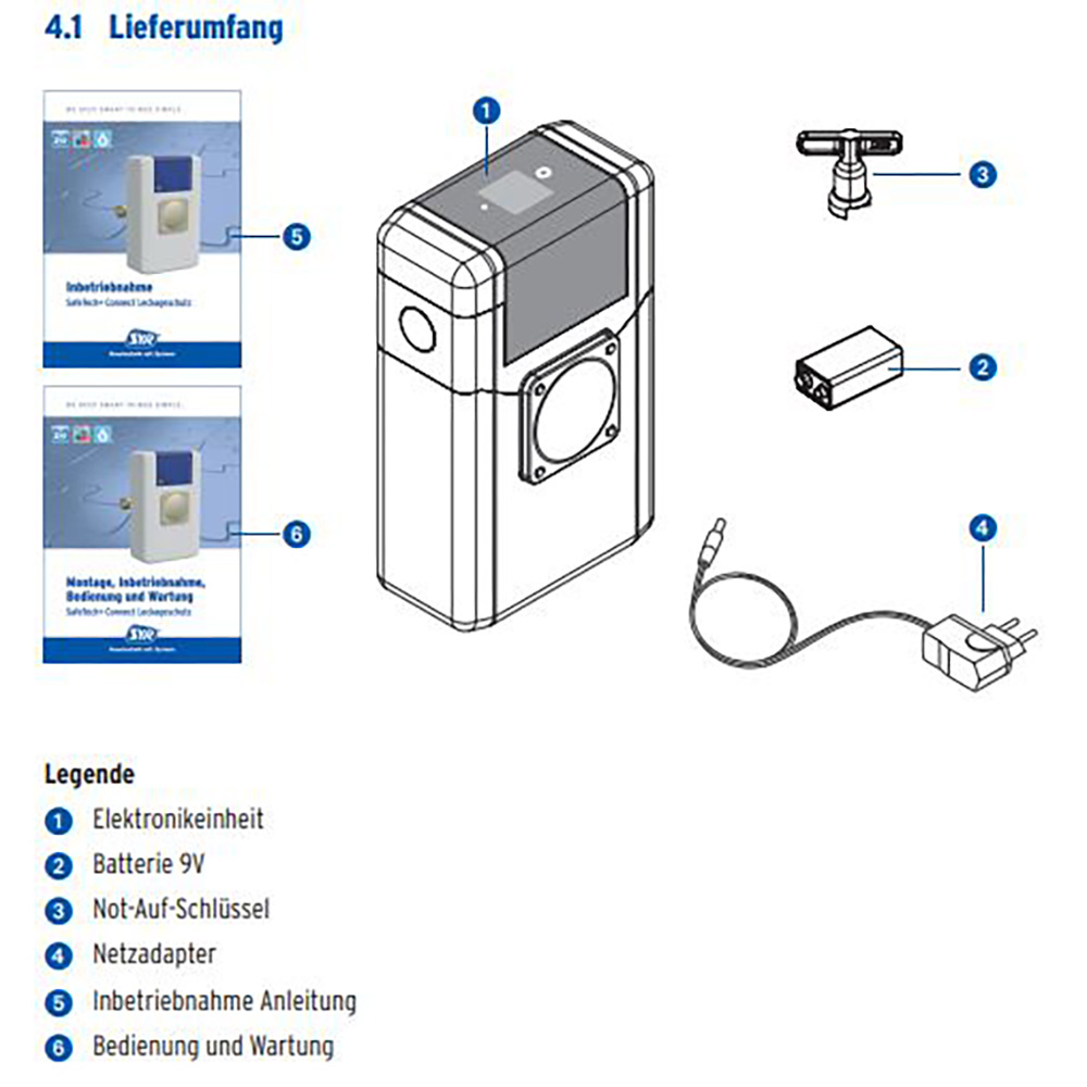 Electronic unit, battery 9V, emergency open key, power adapter, commissioning manual, operation and maintenance manual